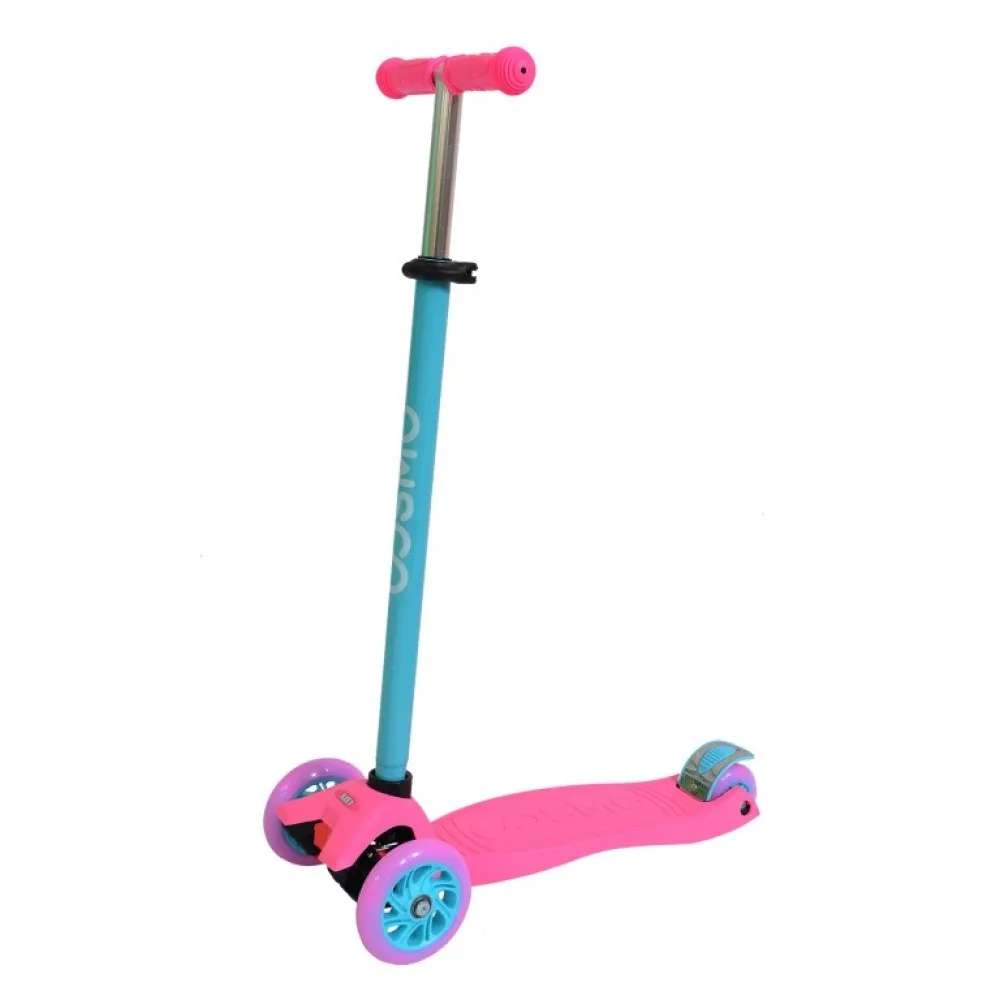 Светодиодные безаккумуляторные колеса из полиуретана работают только во время использования самоката и излучают спектр различных цветов. За счет трех колес обеспечивается высокая устойчивость: 2 передних d-120 мм, заднее d-80 мм. В данной модели используется ножной тормоз фрикционного типа, воздействуя на заднее колесо, он исключает возможность опрокидывания ребенка вперед.